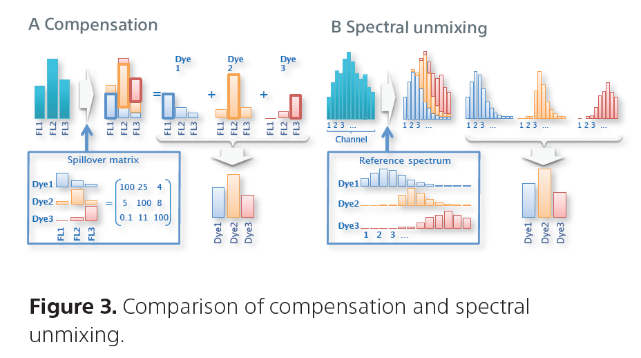 傳統流式細胞儀透過溢漏矩陣 (spillover matrix) 進行補償,從某通道訊號中減去其他通道的溢漏。然而,當染料光譜高度重疊或自發螢光 (autofluorescence) 干擾時,補償效果就大大受限。此外,補償需手動調整單染樣本數據,耗時且易有人為誤差。