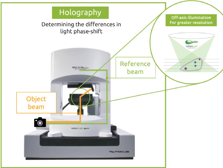 NanoLive 的全息斷層掃描技術是一種結合全息術和斷層掃描原理的新型成像技術。它利用物體對光的折射率差異 (Refractive Index Difference),從多個角度獲取全息影像 (Holographic Images),然後利用計算機重建出物體的三維 (3D) 折射率分佈圖 (RI Tomogram)。