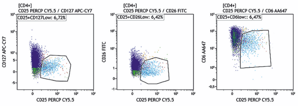 圖1:利用 CD25 的高表達 (橫軸) 與 CD127 的低表達 (縱軸) 特性,可以精準地框選出 Tregs 群體 (圖中左上角區域)。(Source: Identification of circulating regulatory T lymphocytes with membrane markers- a new multiparameter flow cytometry protocol. Piekarska et.,al. 2021. , Figure 1A)