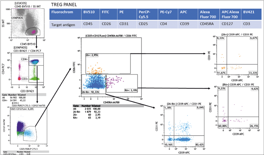 圖2:一個完整的多參數分析策略。從基礎的 CD4⁺ T 細胞開始,逐步利用 CD25/CD127 找到 Tregs,再透過 CD45RA, CD26, CD31, CD39 等標記,將其細分為初始型、效應型、胸腺來源等不同功能亞群。(Source: Identification of circulating regulatory T lymphocytes with membrane markers- a new multiparameter flow cytometry protocol. Piekarska et.,al. 2021. , Figure 5)
